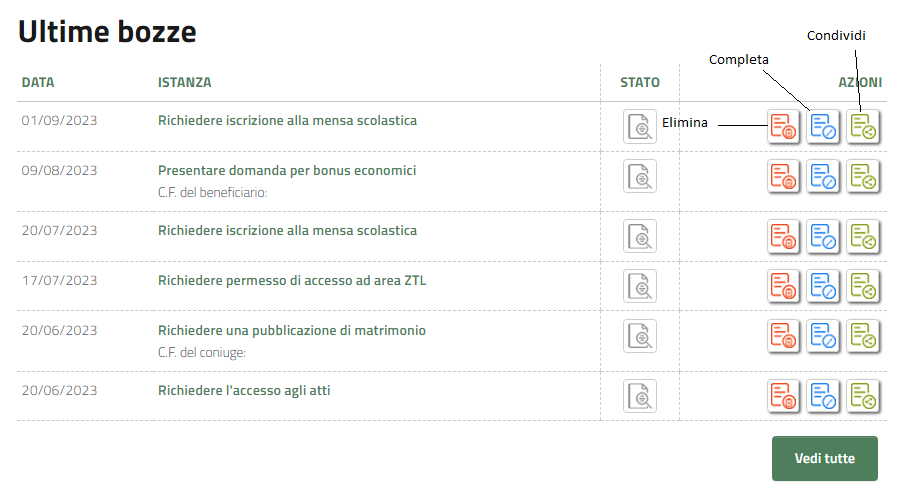 Ultime Bozze: raccolta delle ultime 6 bozze sulle quali è possibile agire mediante i tasti funzione. Cliccare su Vedi tutte per visualizzare tutte le bozze in composizione