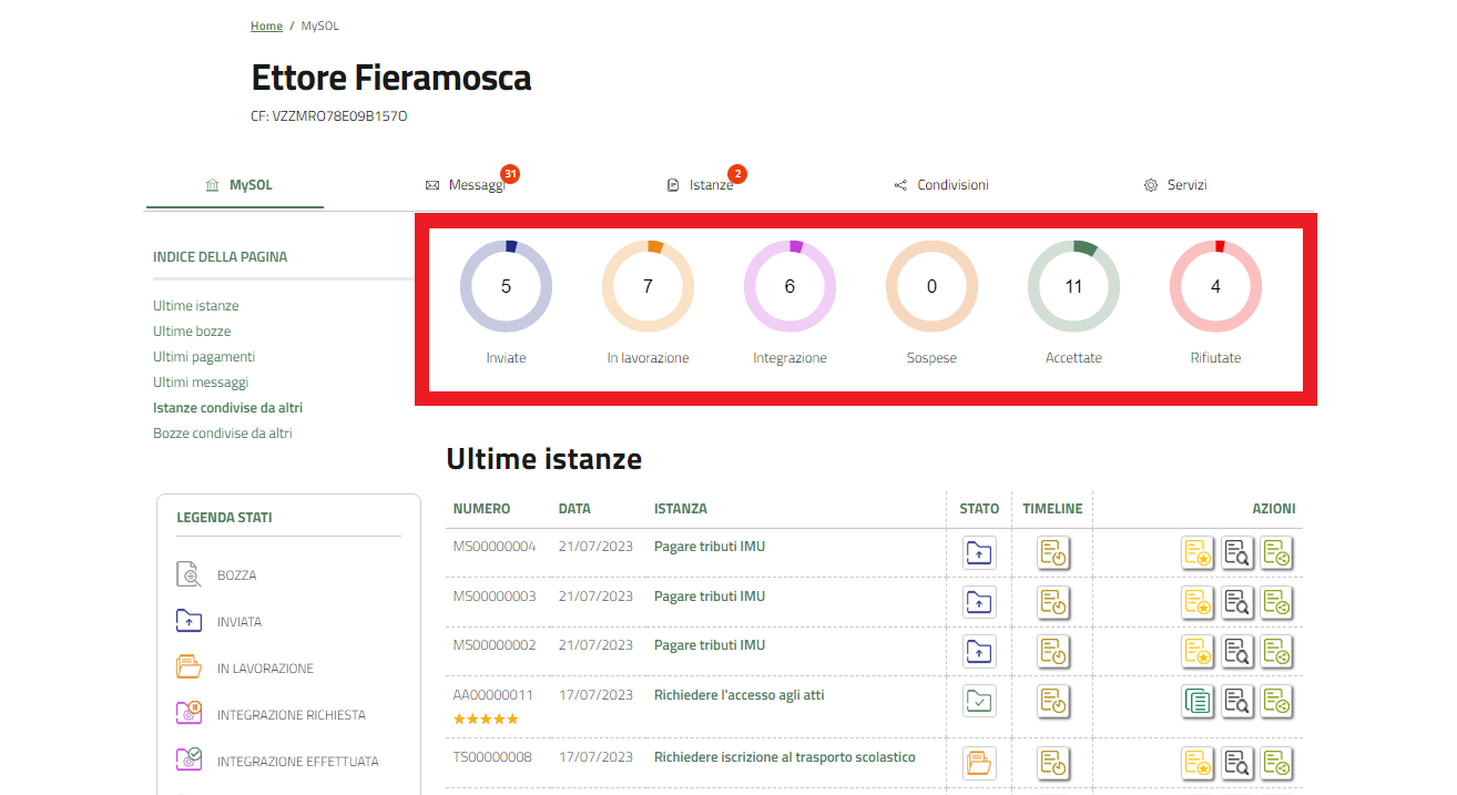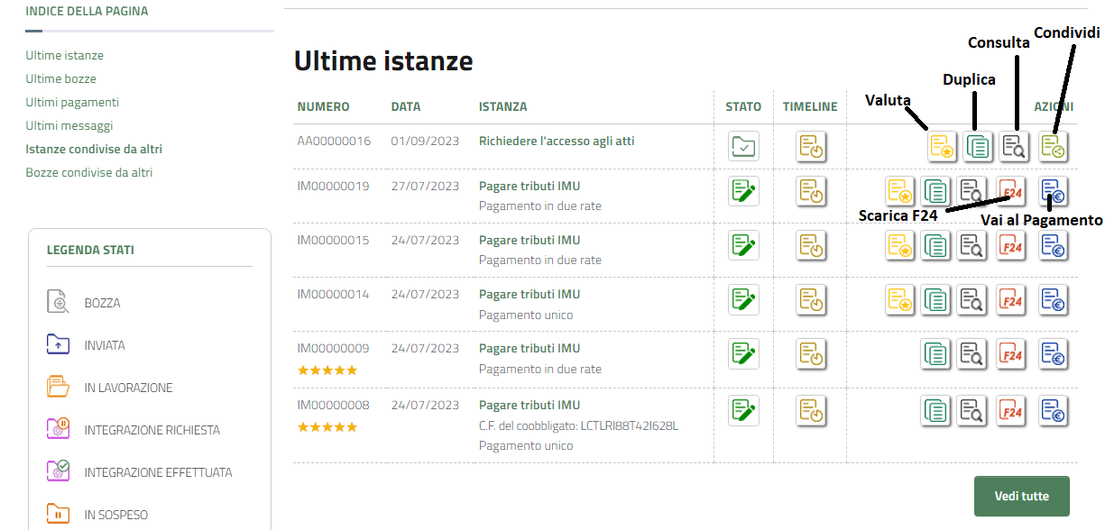 Ultime istanze: E' possibile visualizzare le ultime 6 istanze presentate, controllarne lo stato o interagire mediante le "azioni"