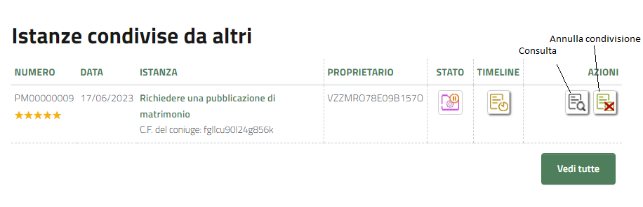 Istanze Condivise da altri: Sono presenti in questo elenco le istanze che altri utenti hanno condiviso con noi, sulle quali possiamo svolgere diverse azioni